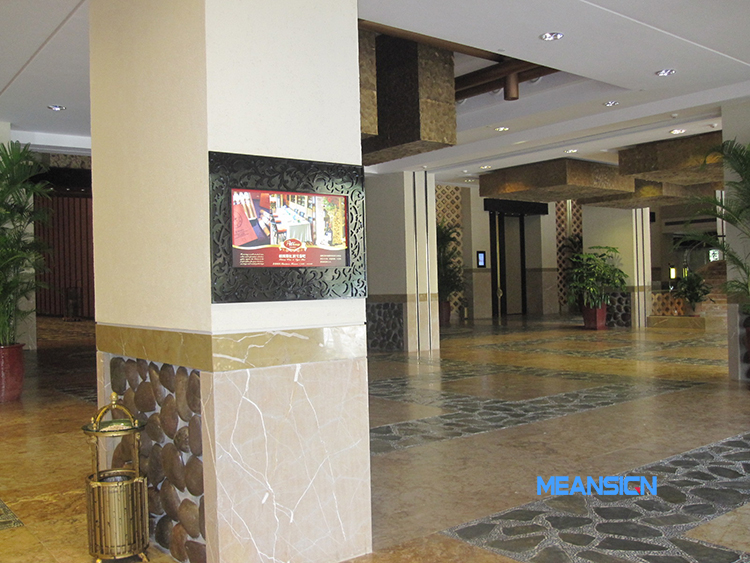 在酒店入住大堂、宴會(huì)廳大堂、會(huì)議廳門口、餐飲區(qū)、電梯口、公共走道處,覆蓋信息發(fā)布一體機(jī),信息發(fā)布系統(tǒng)以視頻、圖文并茂的方式,發(fā)布酒店宣傳片、酒店特色、客房環(huán)境介紹、酒店服務(wù)、宴會(huì)廳酒席介紹、會(huì)議廳環(huán)境介紹、會(huì)議指引、美食、周邊游玩等信息。信息發(fā)布一體機(jī),采用嵌入式的方式安裝在墻壁內(nèi),搭配酒店建設(shè)裝修風(fēng)格,與酒店融為一體,提升酒店的形象檔次。